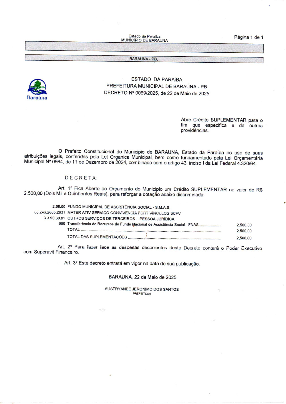 Conforme MP n° 2.200-2 de 24/08/2001, que institui a infraestrutura de chaves Públicas. Matéria Publicada no Diário Oficial do Município de Baraúna/PB no dia - Edição 01398.