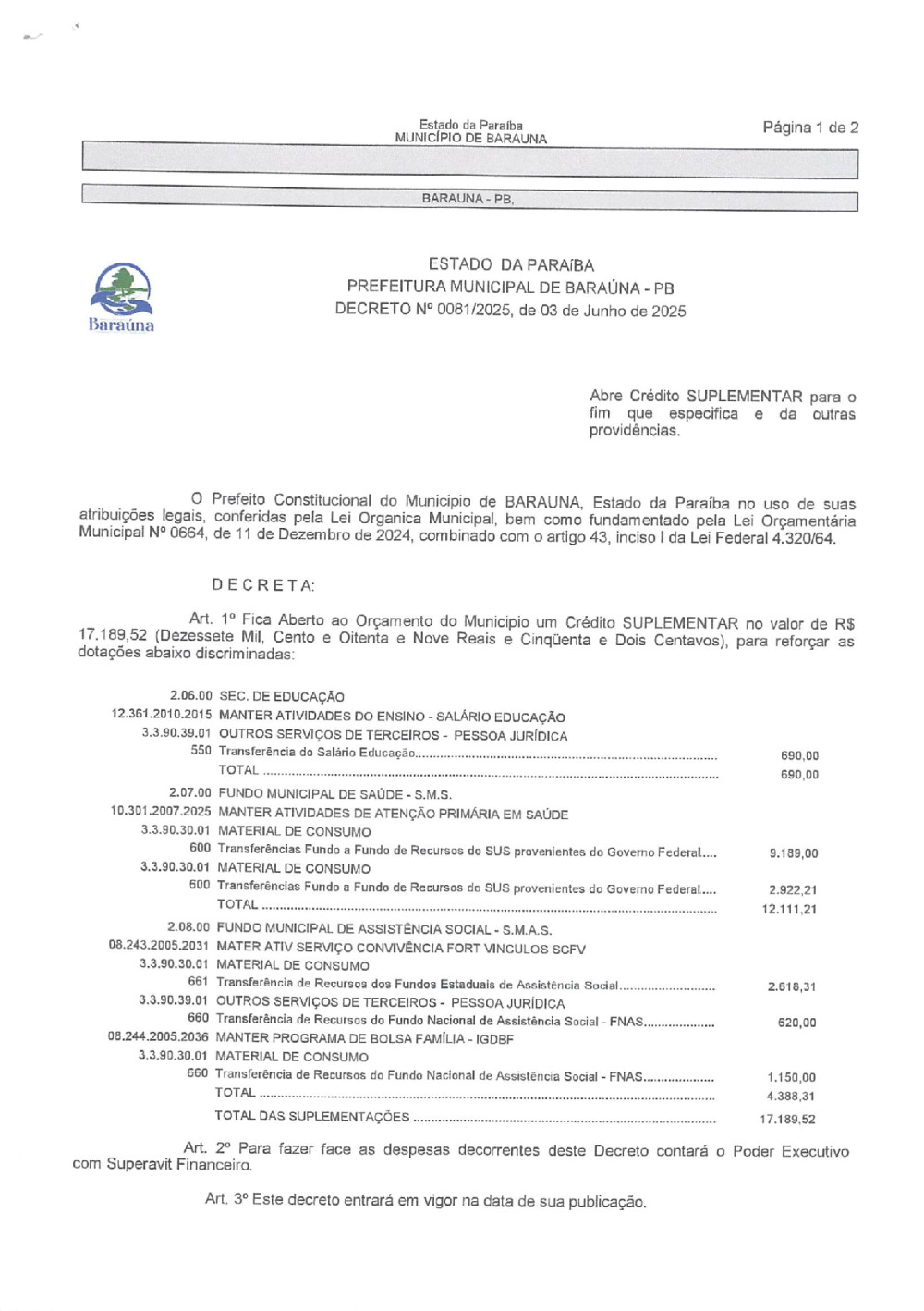DECRETO Nº 081/2025 ABRE CREDITO SUPLEMENTAR. - 08 DE JANEIRO DE 2026.