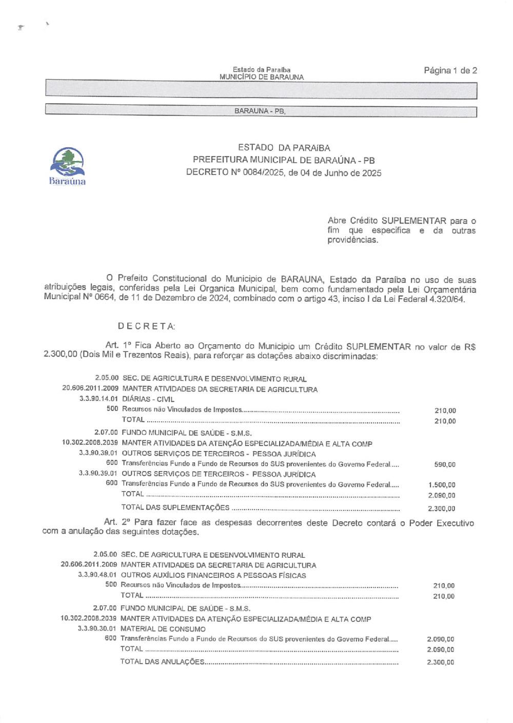 DECRETO Nº 084/2025 ABRE CREDITO SUPLEMENTAR. - 08 DE JANEIRO DE 2026.