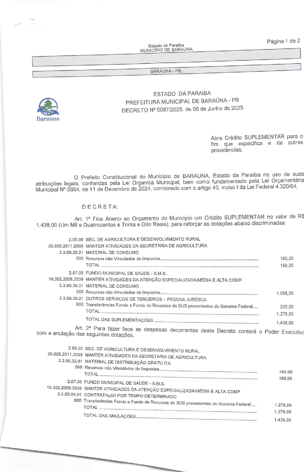 DECRETO Nº 087/2025 ABRE CREDITO SUPLEMENTAR. - 08 DE JANEIRO DE 2026.