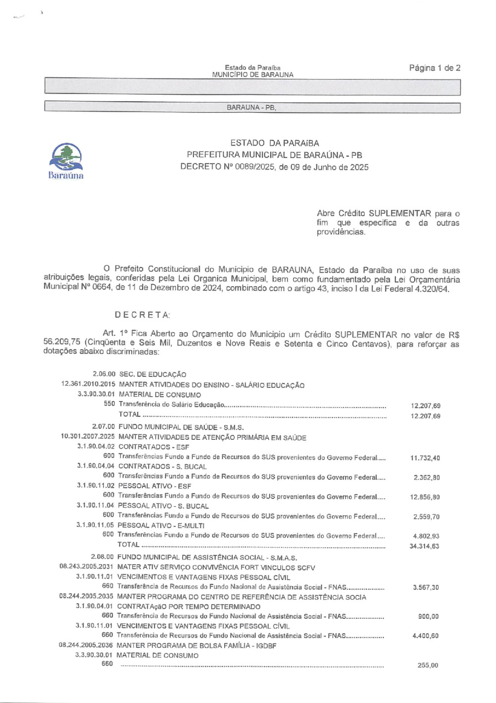 DECRETO Nº 089/2025 ABRE CREDITO SUPLEMENTAR. - 08 DE JANEIRO DE 2026.