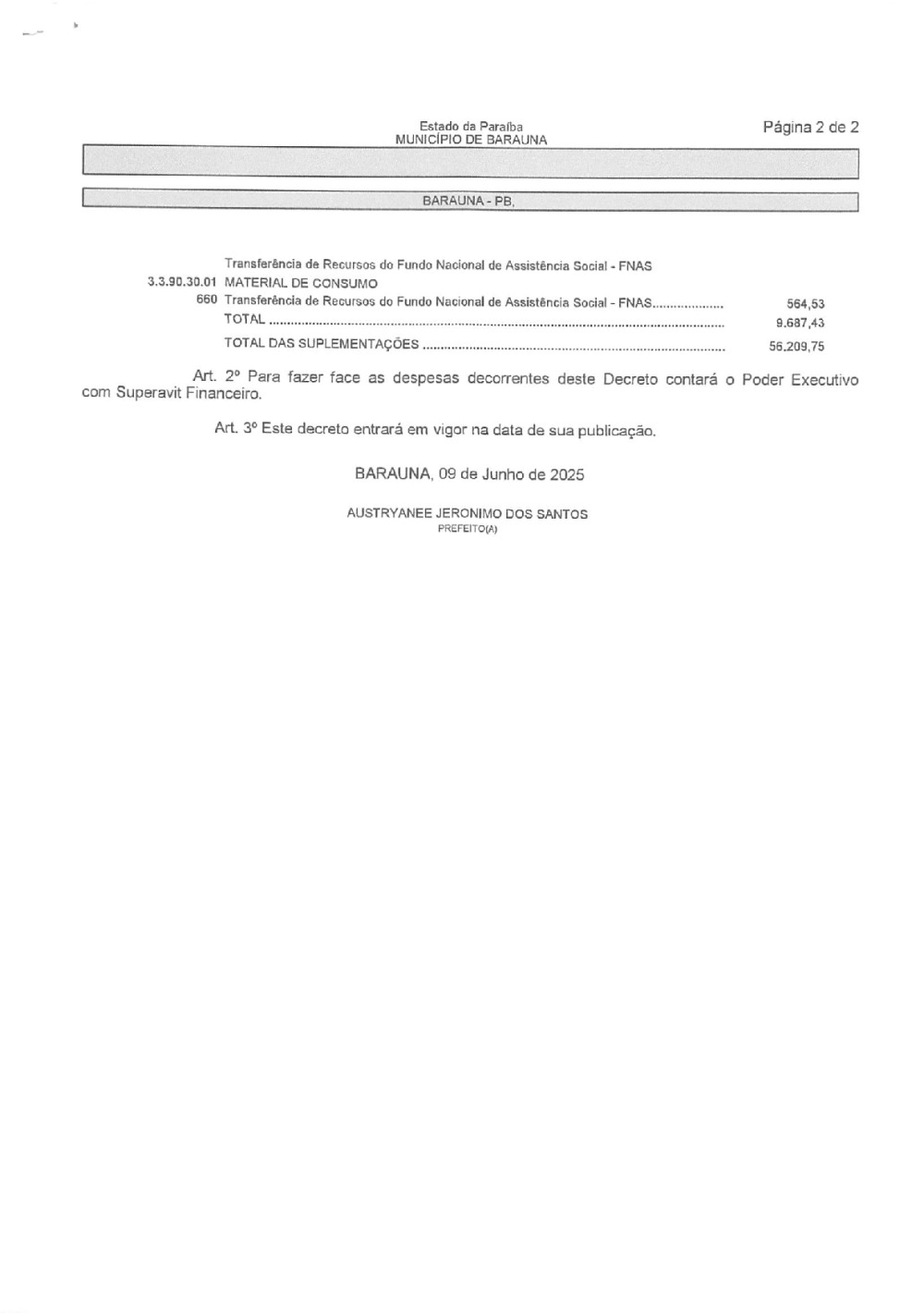 Conforme MP n° 2.200-2 de 24/08/2001, que institui a infraestrutura de chaves Públicas. Matéria Publicada no Diário Oficial do Município de Baraúna/PB no dia - Edição 01399.