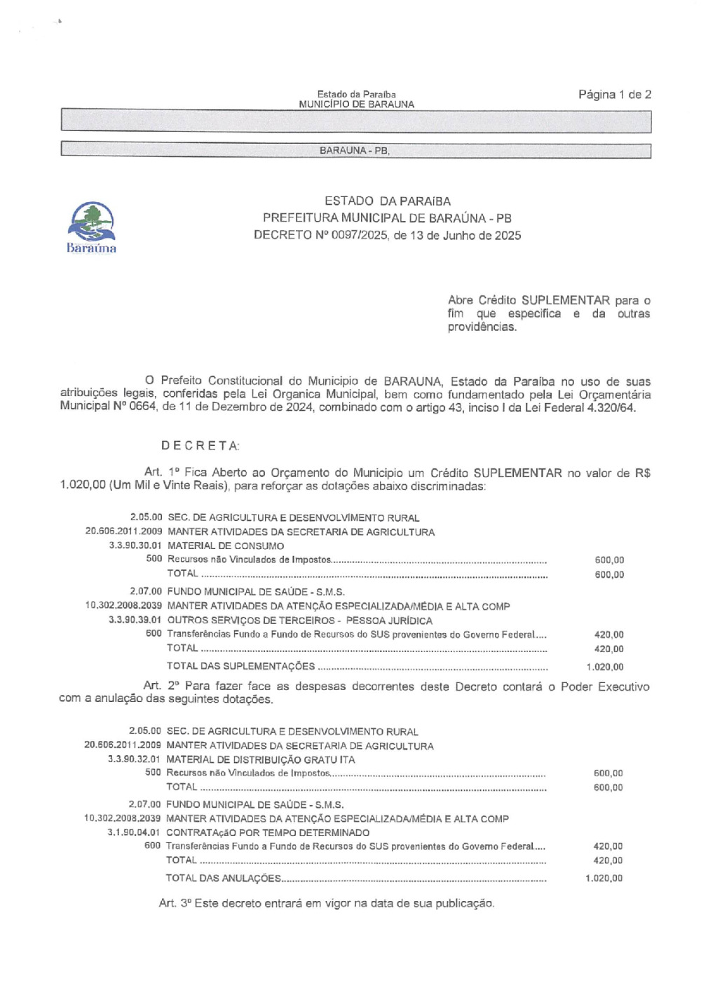 DECRETO Nº 097/2025 ABRE CREDITO SUPLEMENTAR. - 08 DE JANEIRO DE 2026.