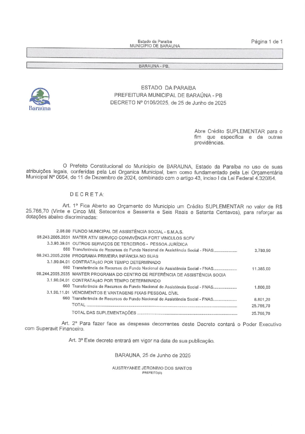 DECRETO Nº 0106/2025 ABRE CREDITO SUPLEMENTAR. - 08 DE JANEIRO DE 2026.