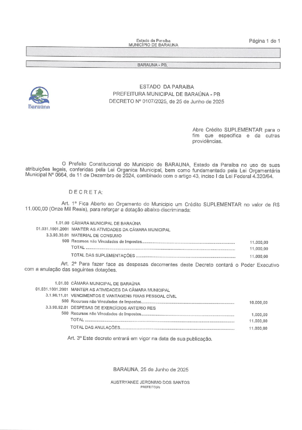 DECRETO Nº 0107/2025 ABRE CREDITO SUPLEMENTAR. - 08 DE JANEIRO DE 2025.