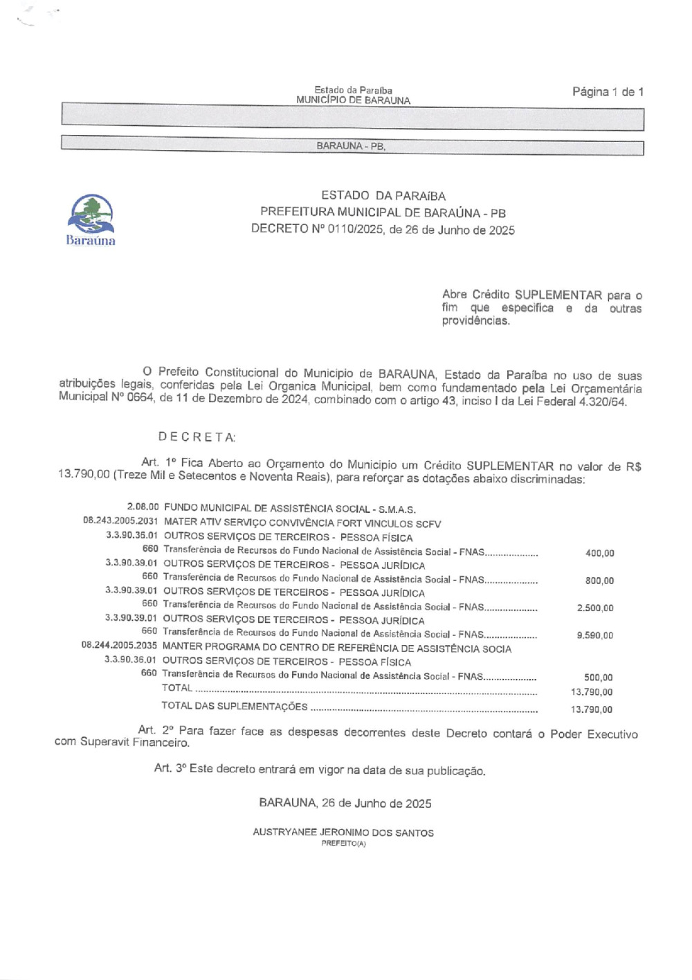 DECRETO Nº 0110/2025 ABRE CREDITO SUPLEMENTAR. - 08 DE JANEIRO DE 2026.