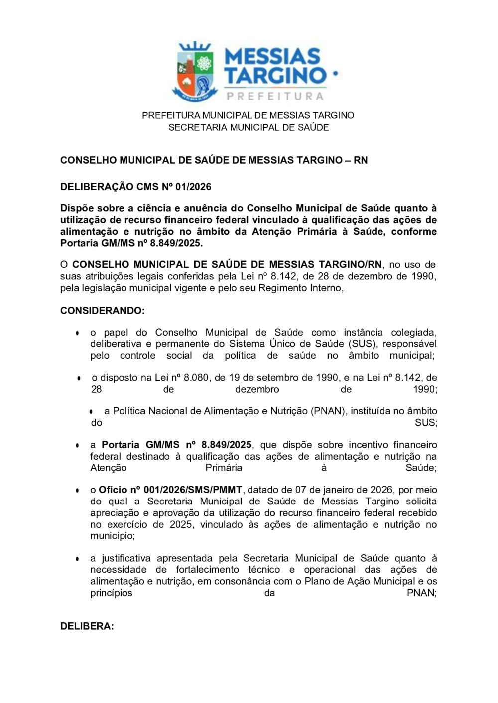 DELIBERAÇÃO CMS N°01/26