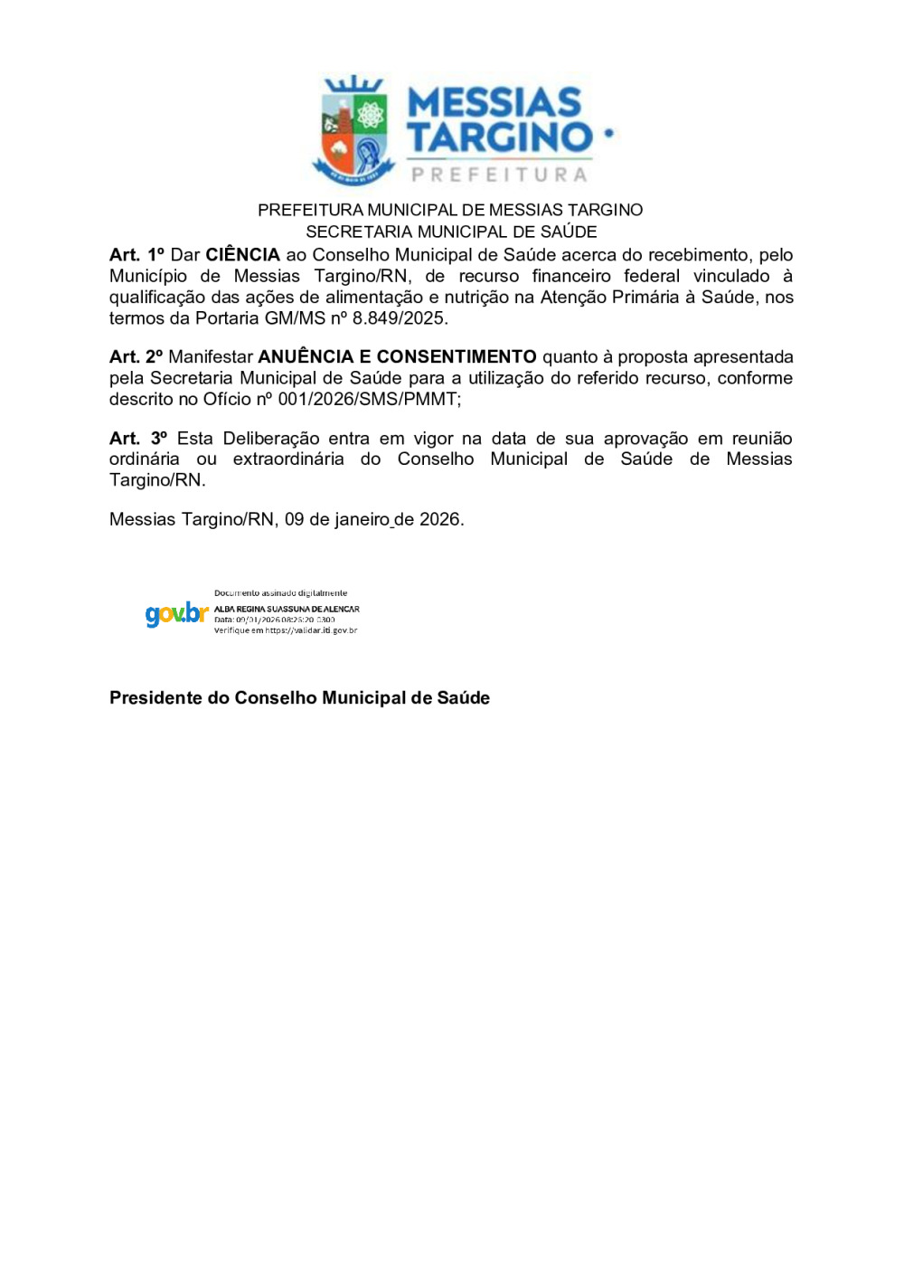 Conforme MP n° 2.200-2 de 24/08/2001, que institui a infraestrutura de chaves Públicas. Matéria Publicada no Diário Oficial do Município de Messias Targino/RN no dia - Edição 01449.