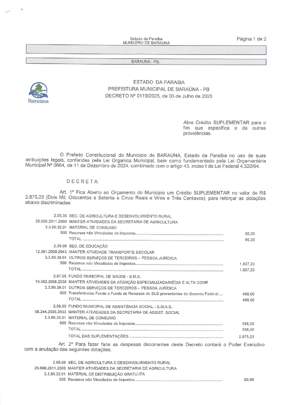 DECRETO Nº 0119/2025 ABRE CREDITO SUPLEMENTAR. - 09 DE JANEIRO DE 2026.