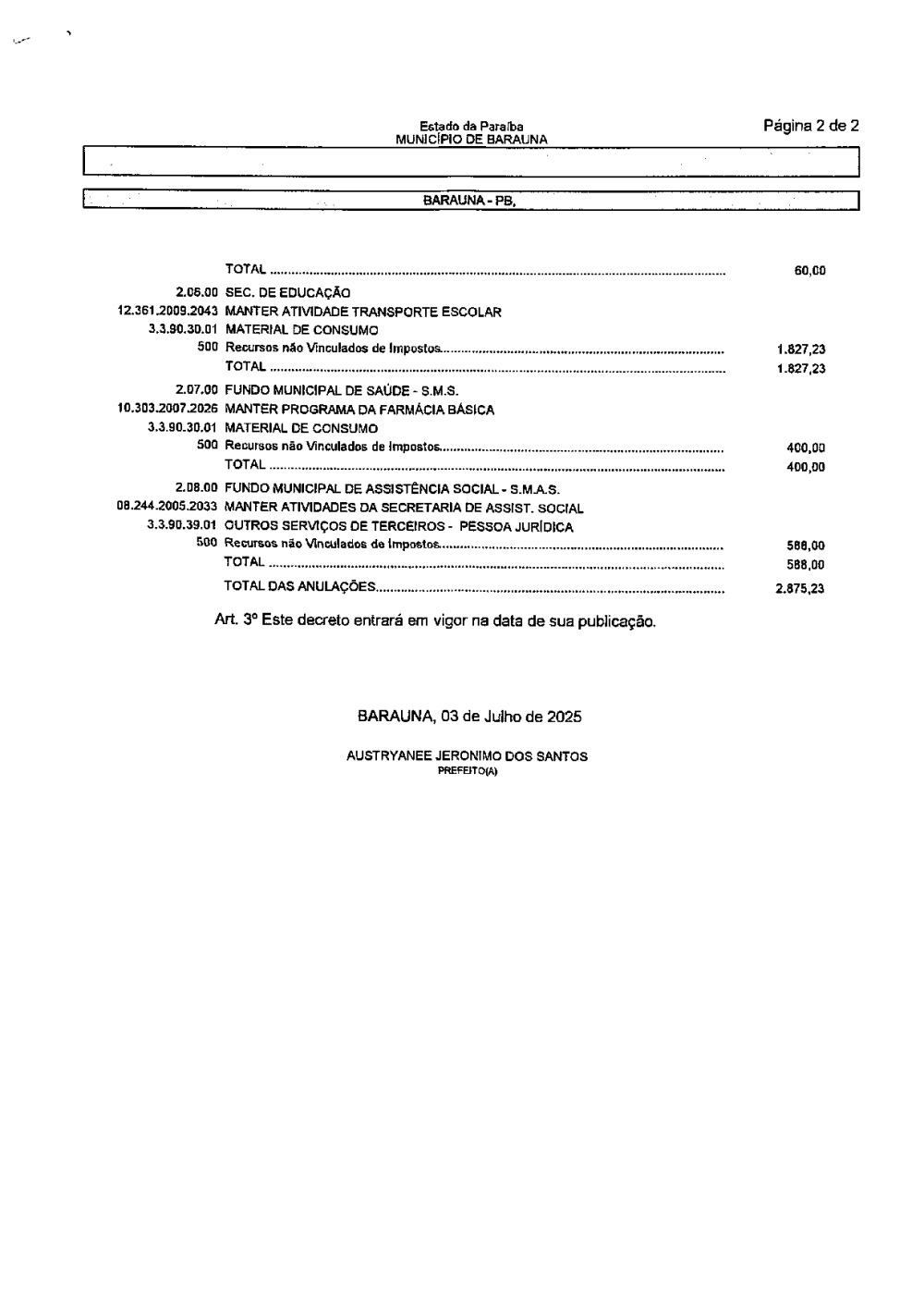 Conforme MP n° 2.200-2 de 24/08/2001, que institui a infraestrutura de chaves Públicas. Matéria Publicada no Diário Oficial do Município de Baraúna/PB no dia - Edição 01400.