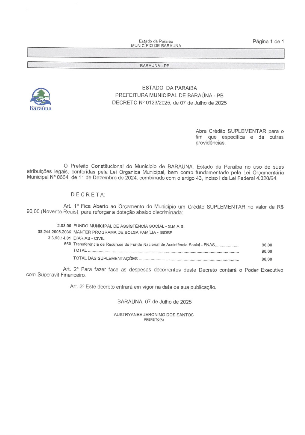 DECRETO Nº 0123/2025 ABRE CREDITO SUPLEMENTAR. - 09 DE JANEIRO DE 2026.