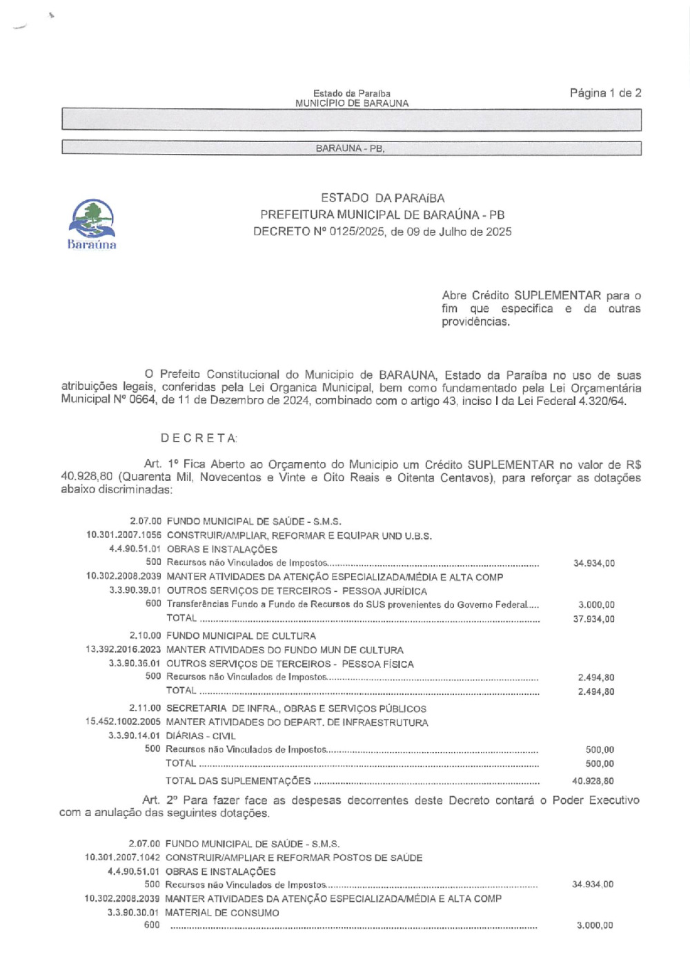 DECRETO Nº 0125/2025 ABRE CREDITO SUPLEMENTAR. - 09 DE JANEIRO DE 2026.