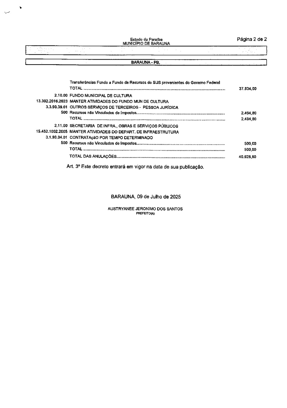 Conforme MP n° 2.200-2 de 24/08/2001, que institui a infraestrutura de chaves Públicas. Matéria Publicada no Diário Oficial do Município de Baraúna/PB no dia - Edição 01400.