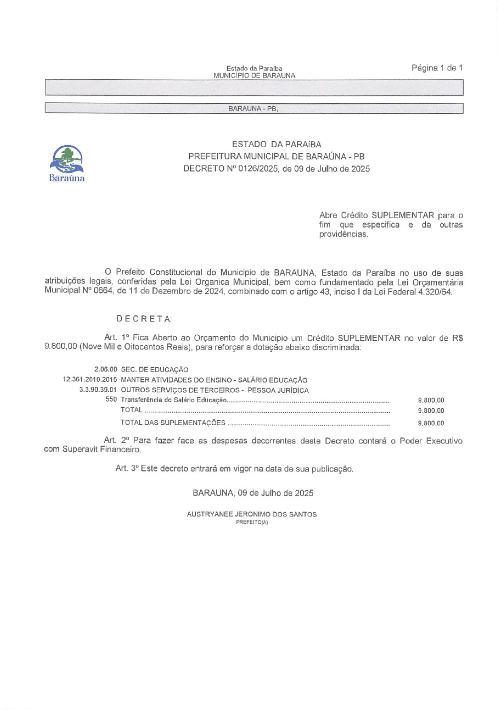 DECRETO Nº 0126/2025 ABRE CREDITO SUPLEMENTAR. - 09 DE JANEIRO DE 2026.