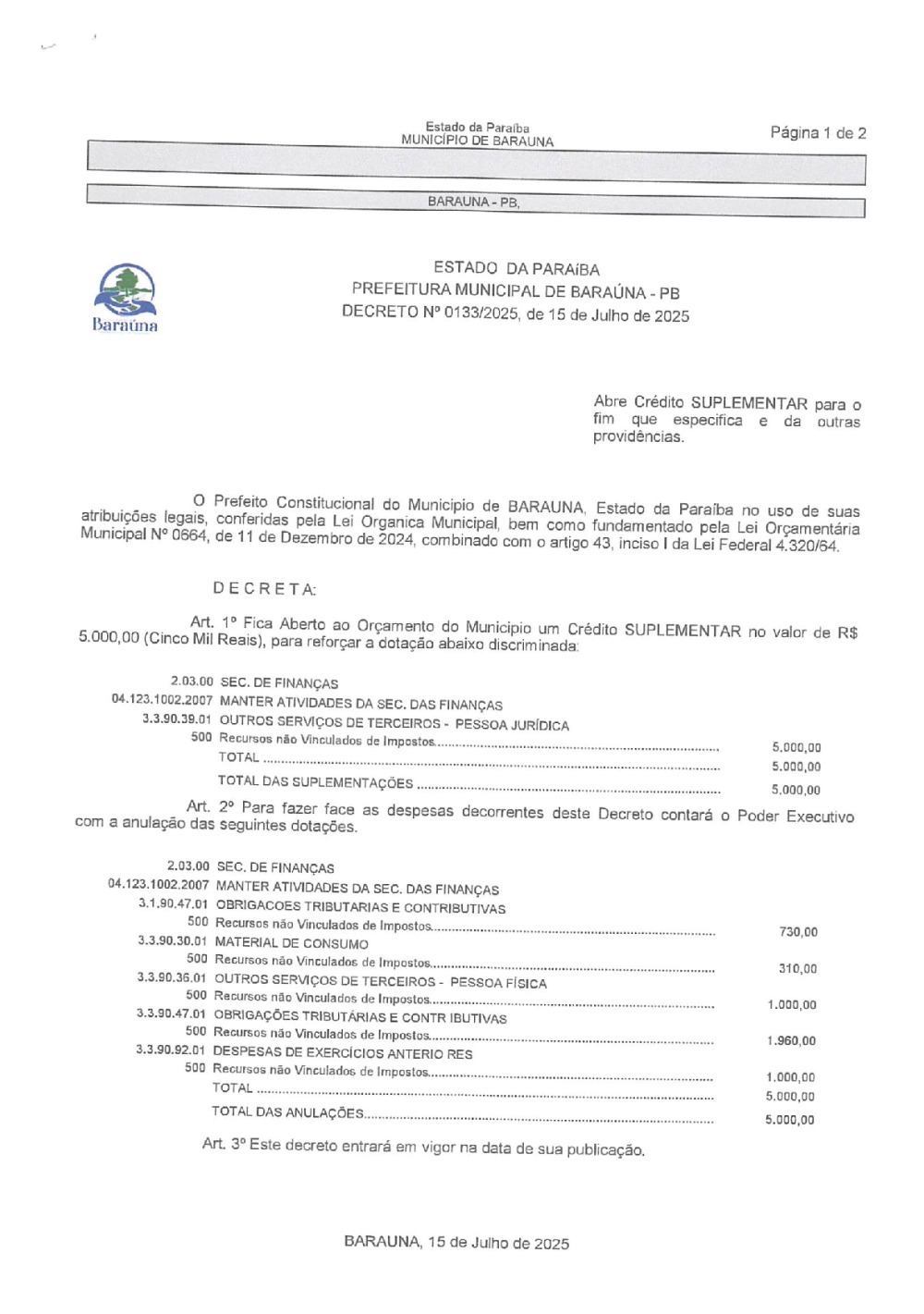 DECRETO Nº 0133/2025 ABRE CREDITO SUPLEMENTAR. - 09 DE JANEIRO DE 2026.