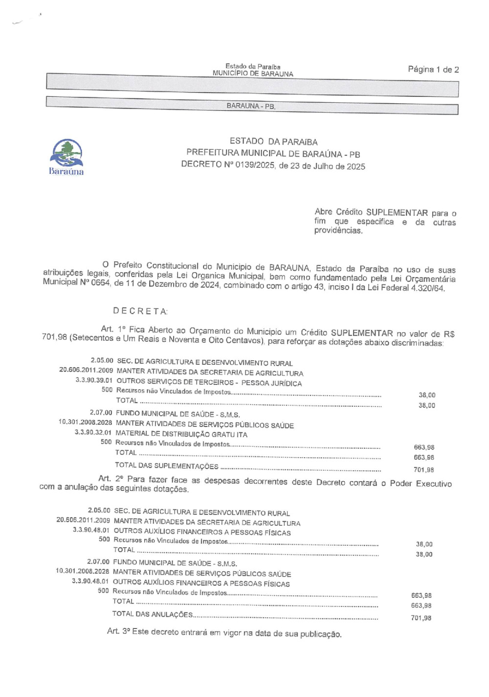DECRETO Nº 0139/2025 ABRE CREDITO SUPLEMENTAR. - 09 DE JANEIRO DE 2025.
