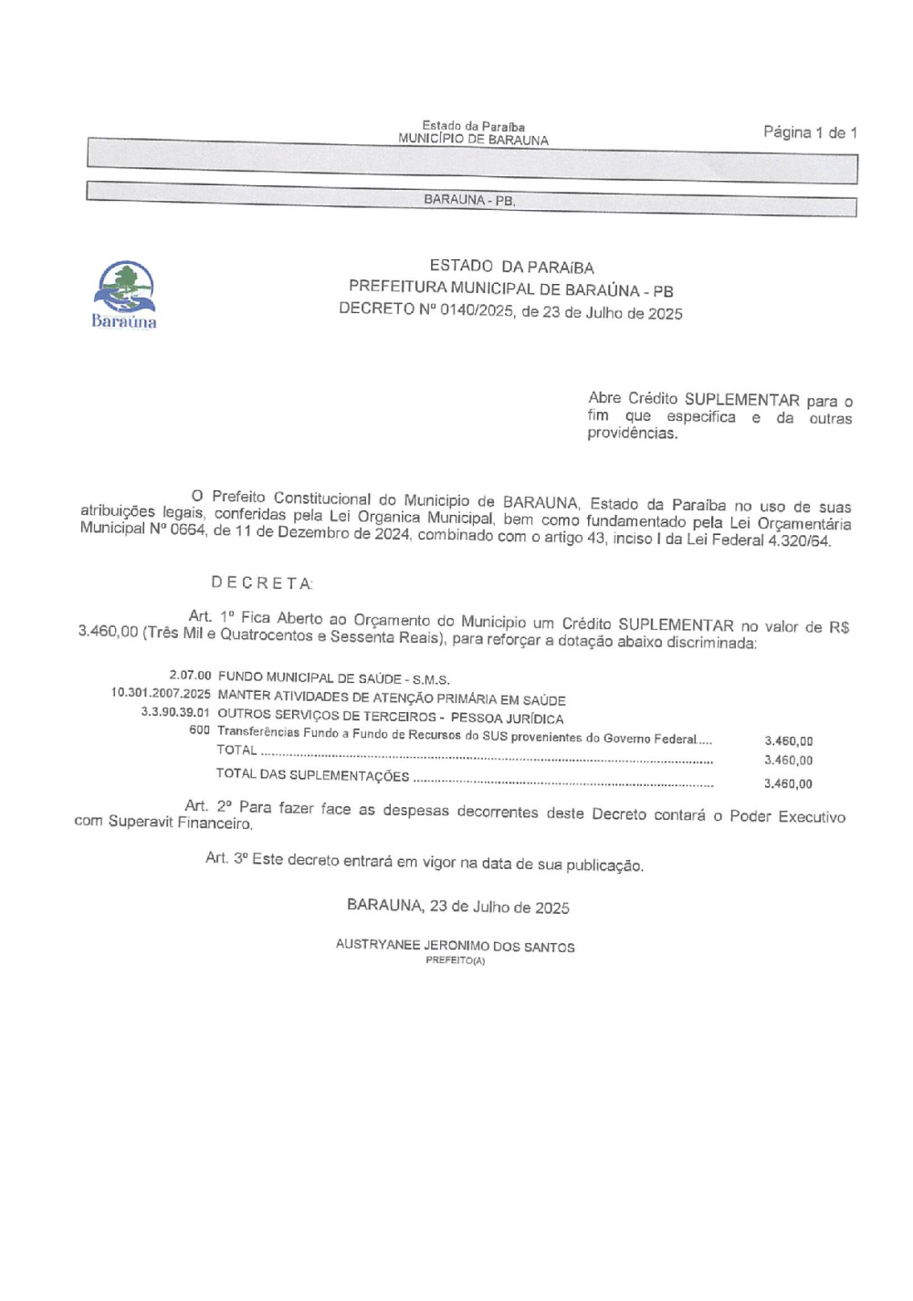 DECRETO Nº 0140/2025 ABRE CREDITO SUPLEMENTAR. - 09 DE JANEIRO DE 2026.