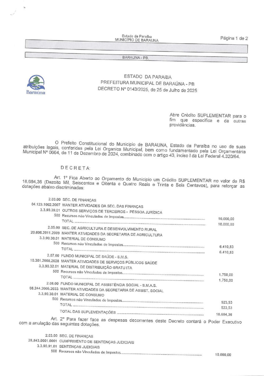 DECRETO Nº 0143/2025 ABRE CREDITO SUPLEMENTAR. - 09 DE JANEIRO DE 2026.