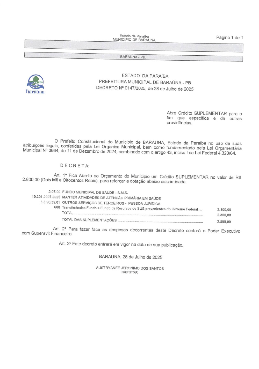 Conforme MP n° 2.200-2 de 24/08/2001, que institui a infraestrutura de chaves Públicas. Matéria Publicada no Diário Oficial do Município de Baraúna/PB no dia - Edição 01400.