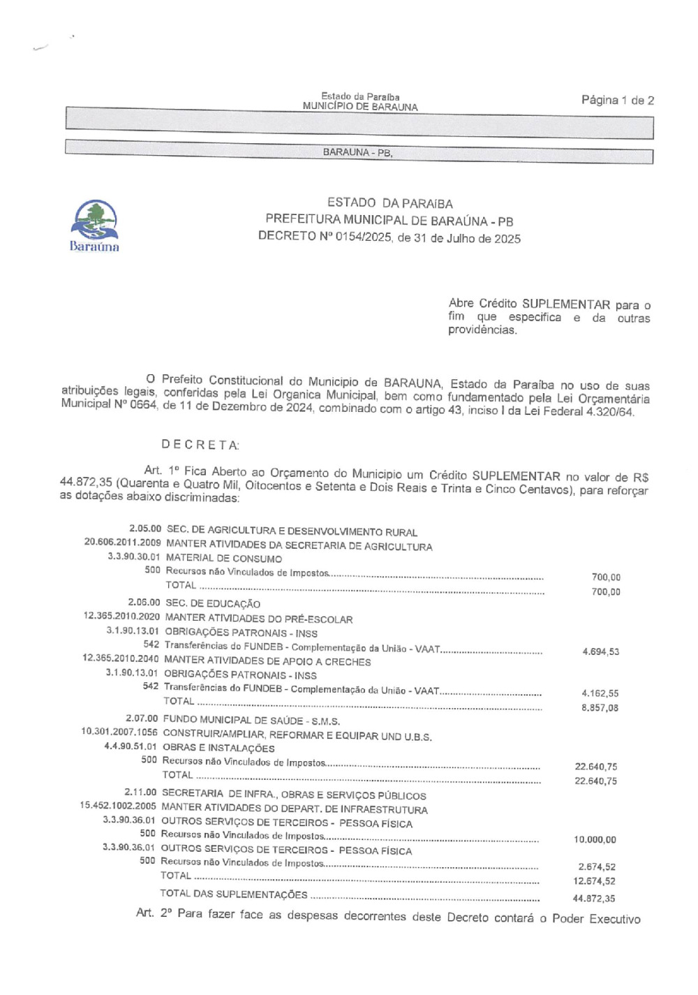 DECRETO Nº 0154/2025 ABRE CREDITO MSUPLEMENTAR. - 09 DE JANEIRO DE 2026.