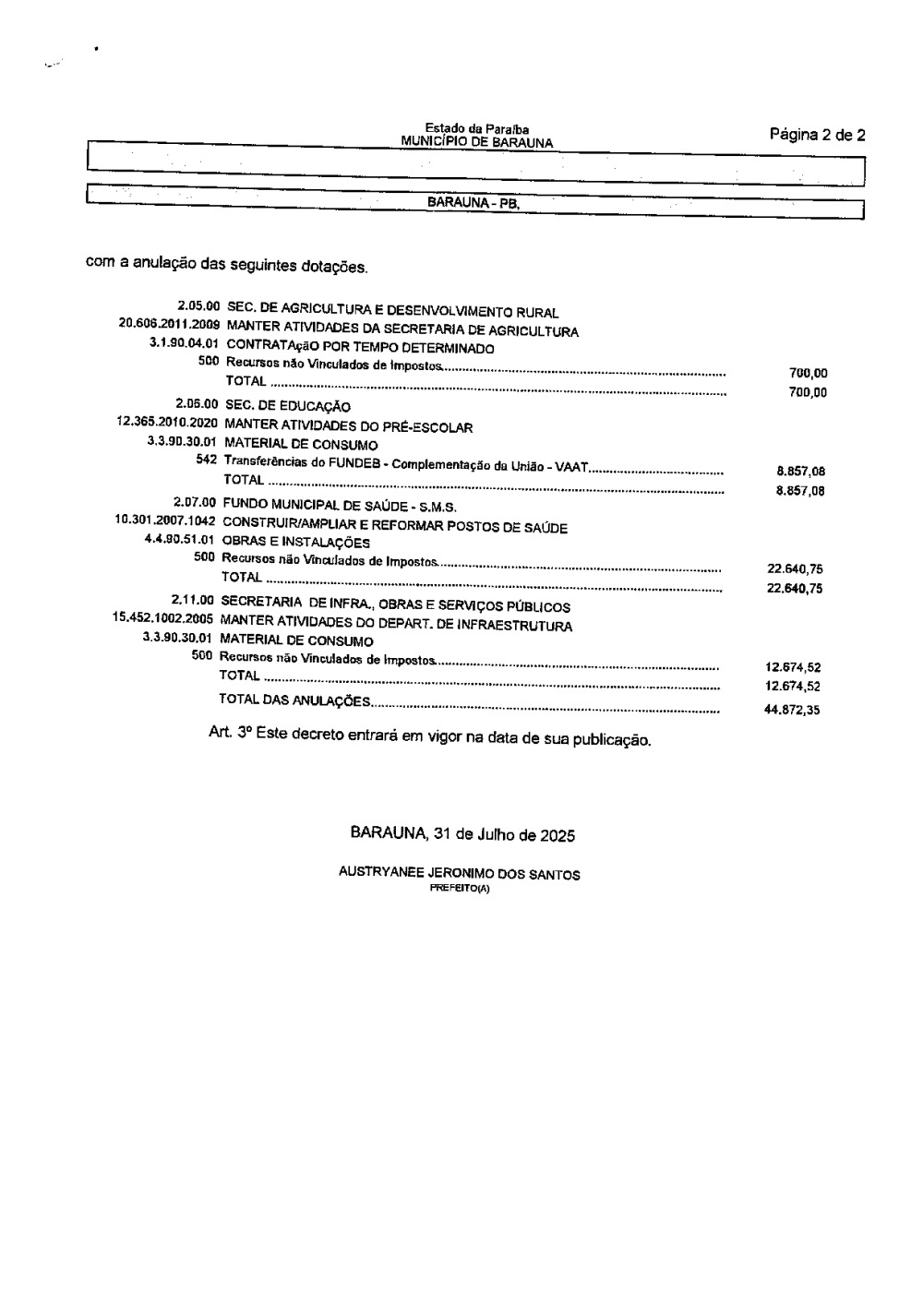 Conforme MP n° 2.200-2 de 24/08/2001, que institui a infraestrutura de chaves Públicas. Matéria Publicada no Diário Oficial do Município de Baraúna/PB no dia - Edição 01400.