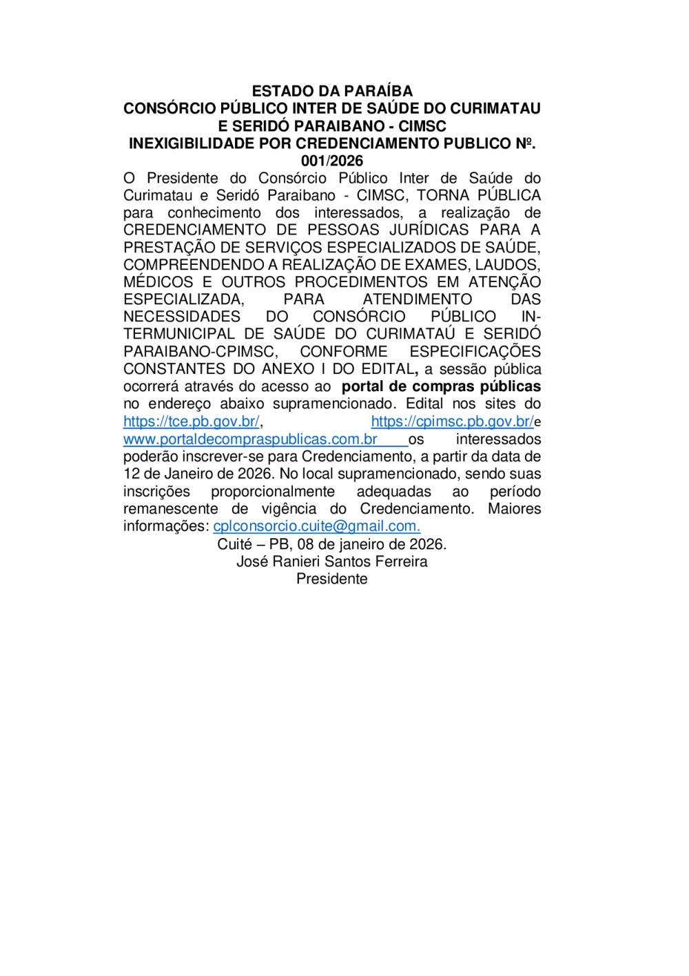 INEXIGIBILIDADE POR CREDENCIAMENTO PUBLICO N° 0001/2026
