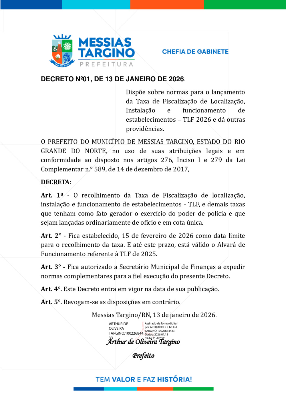 Conforme MP n° 2.200-2 de 24/08/2001, que institui a infraestrutura de chaves Públicas. Matéria Publicada no Diário Oficial do Município de Messias Targino/RN no dia - Edição 01451.