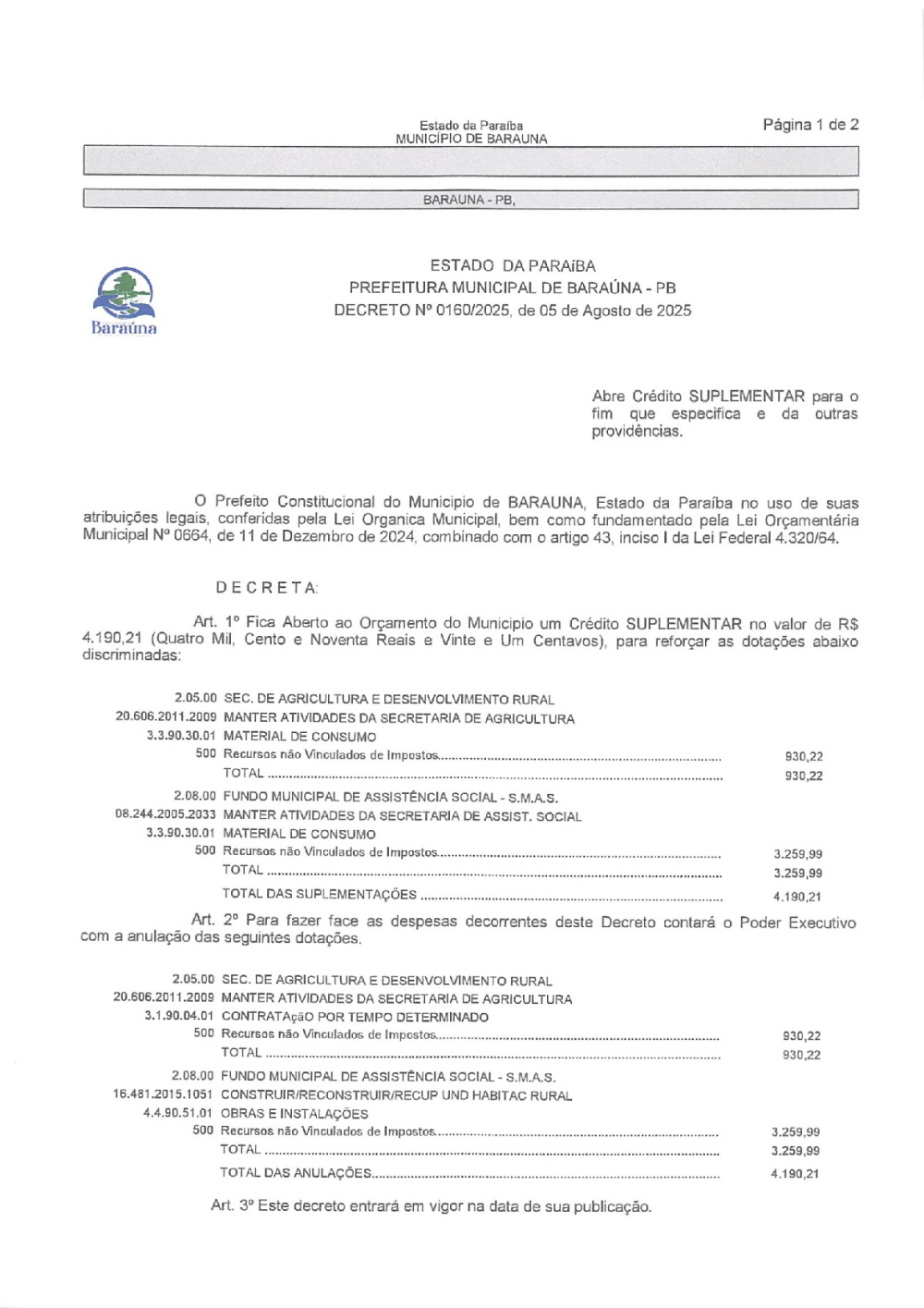 DECRETO Nº 160/2025 ABRE CREDITO SUPLEMENTAR. - 15 DE JANEIRO DE 2026.
