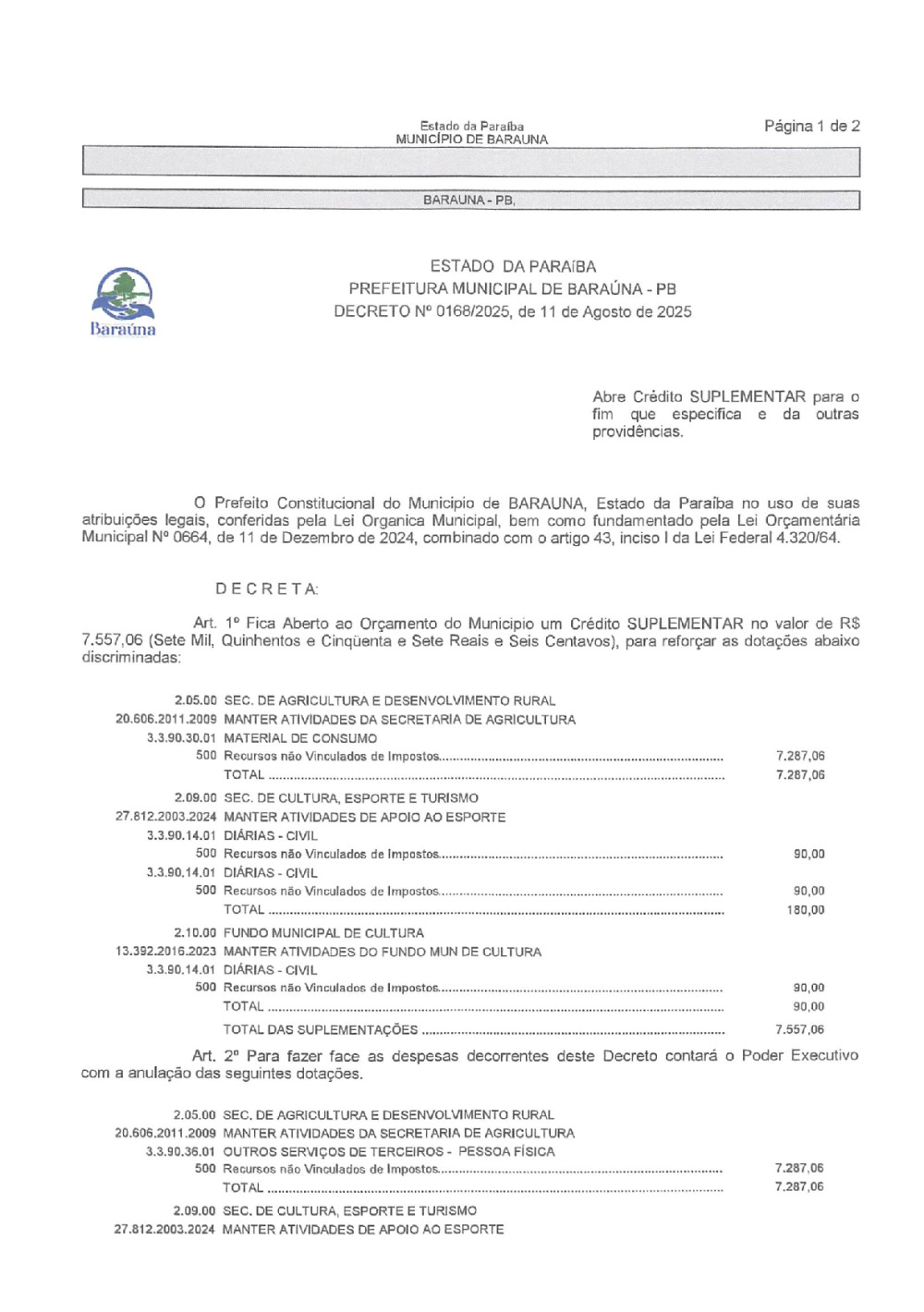 DECRETO Nº 0168/2025 ABRE CREDITO SUPLEMENTAR. - 15 DE JANEIRO DE 2026.