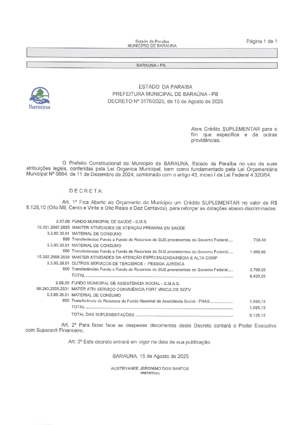 DECRETO Nº 0176/2025 ABRE CREDITO SUPLEMENTAR. - 16 DE JANEIRO DE 2026.