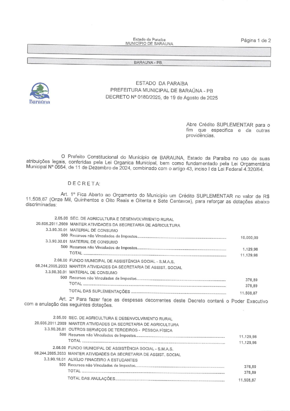 DECRETO Nº 0180/2025 ABRE CREDITO SUPLEMENTAR. - 16 DE JANEIRO DE 2026.