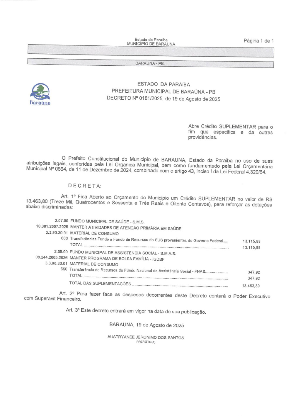 RETIFICAÇÃO - DECRETO N° 0181/2025 ABRE CREDITO SUPLEMENTAR. - 16 DE JANEIRO DE 2026.