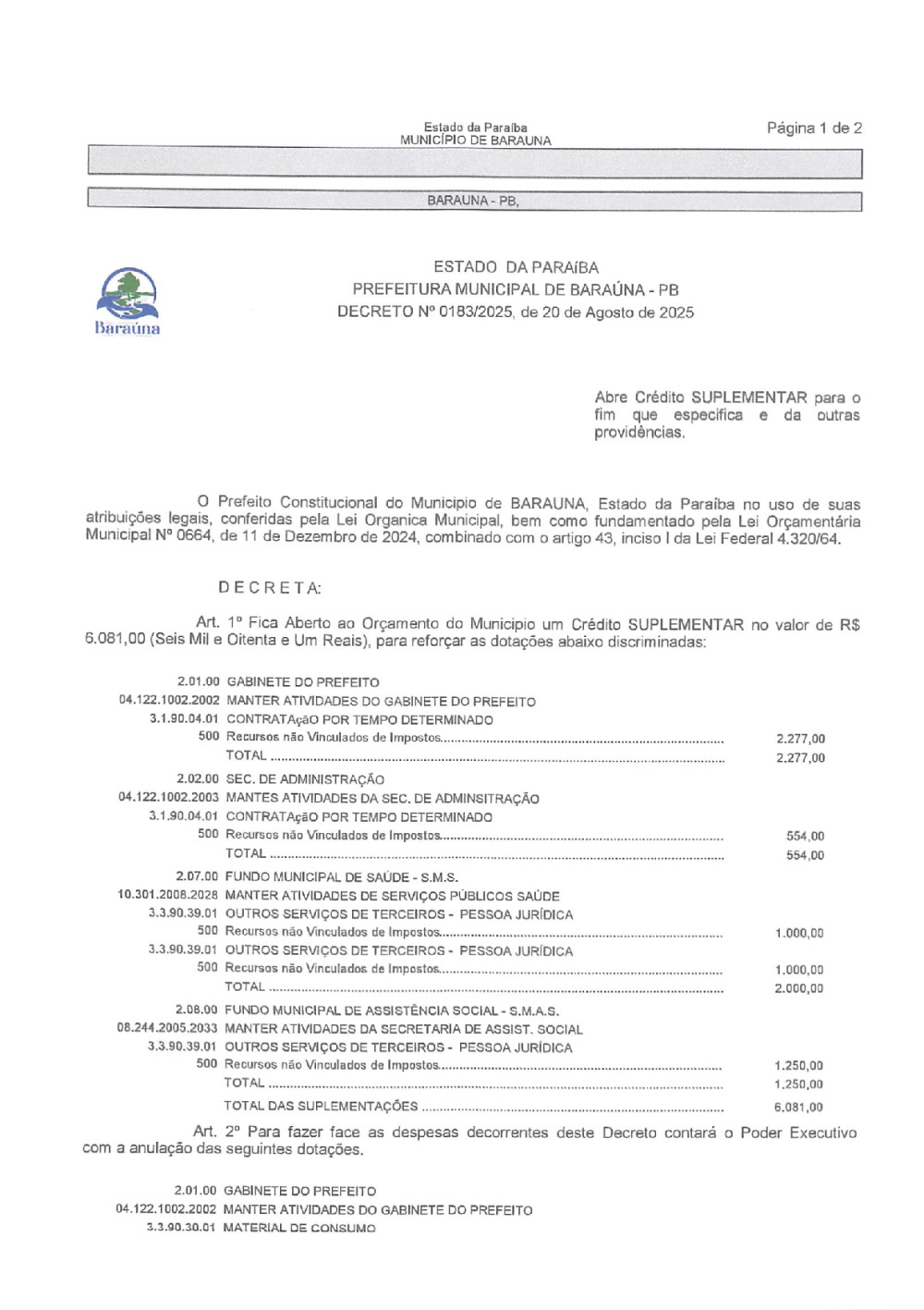DECRETO Nº 0183/2025 ABRE CREDITO SUPLEMENTAR. - 16 DE JANEIRO DE 2026.