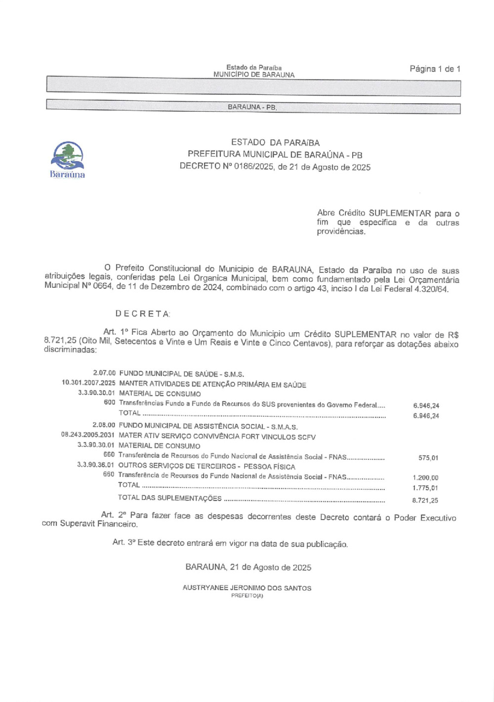 DECRETO Nº 0186/2025 ABRE CREDITO SUPLEMENTAR. - 16 DE JANEIRO DE 2026.