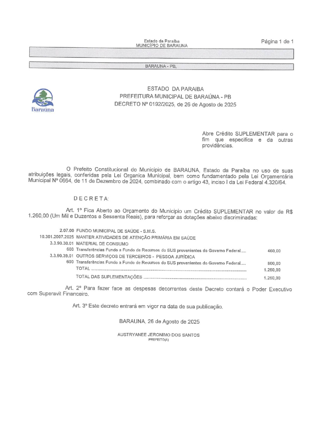 DECRETO Nº 0192/2025 ABRE CREDITO SUPLEMENTAR. - 16 DE JANEIRO DE 2026.