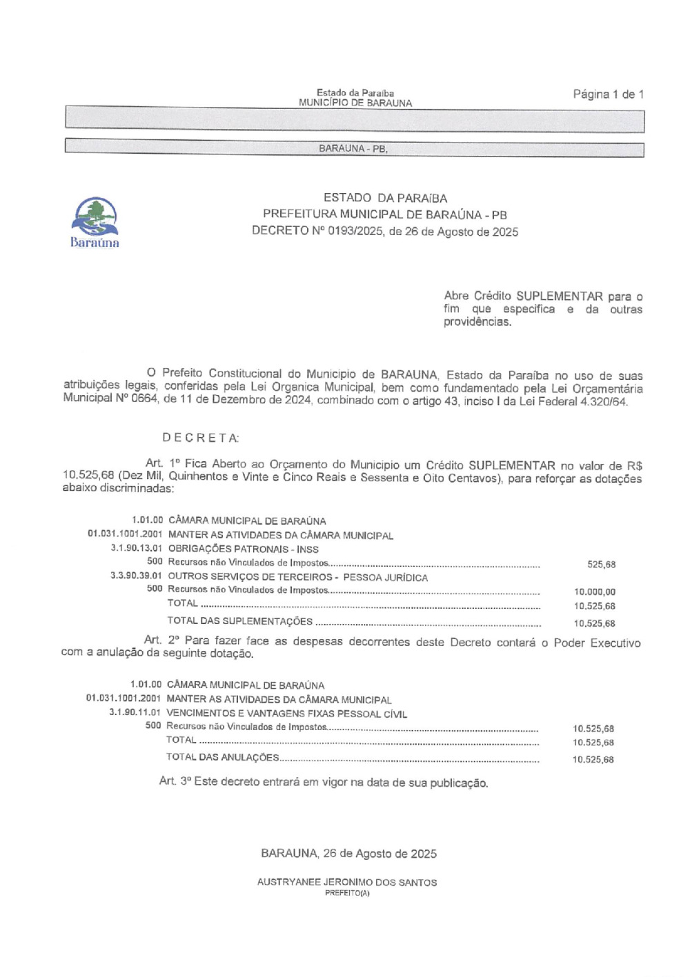 DECRETO N° 0193/2025 ABRE CREDITO SUPLEMENTAR. - 16 DE JANEIRO DE 2026.