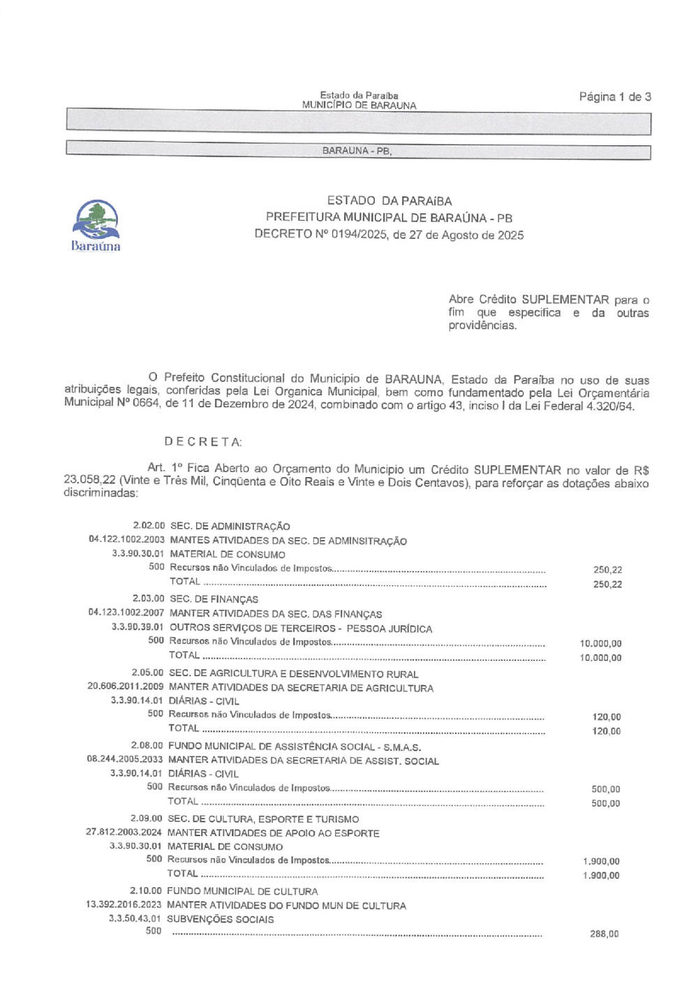 DECRETO Nº 0194/2025 ABRE CREDITO SUPLEMENTAR. - 16 DE JANEIRO DE 2026.