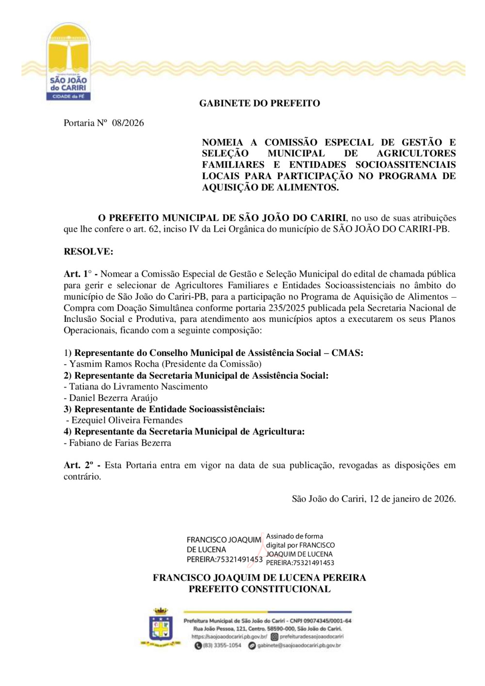 PORTARIA 08/202 - NOMEAR A COMISSÃO ESPECIAL DE GESTÃO E SELEÇÃO MUNICIPAL DO EDITAL DE CHAMADA PÚBLICA PARA GERIR E SELECIONAR DE AGRICULTORES FAMILIARES E ENTIDADES SOCIOASSISTENCIAIS NO ÂMBITO DO MUNICÍPIO DE SÃO JOÃO DO CARIRI-PB