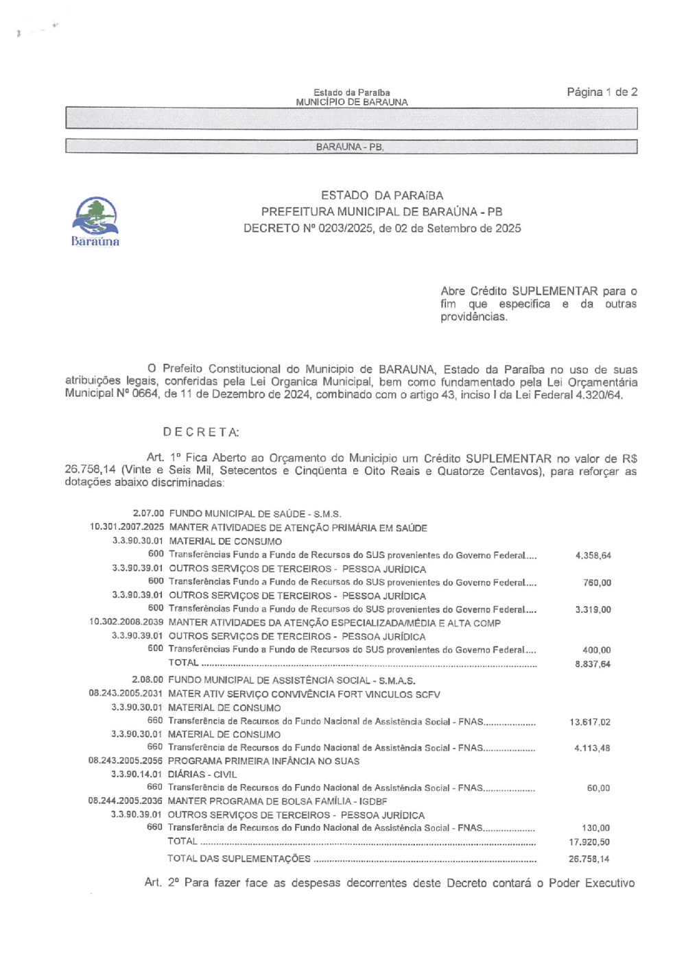 DECRETO Nº 0203/2025 ABRE CREDITO SUPLEMENTAR. - 20 DE JANEIRO DE 2026.