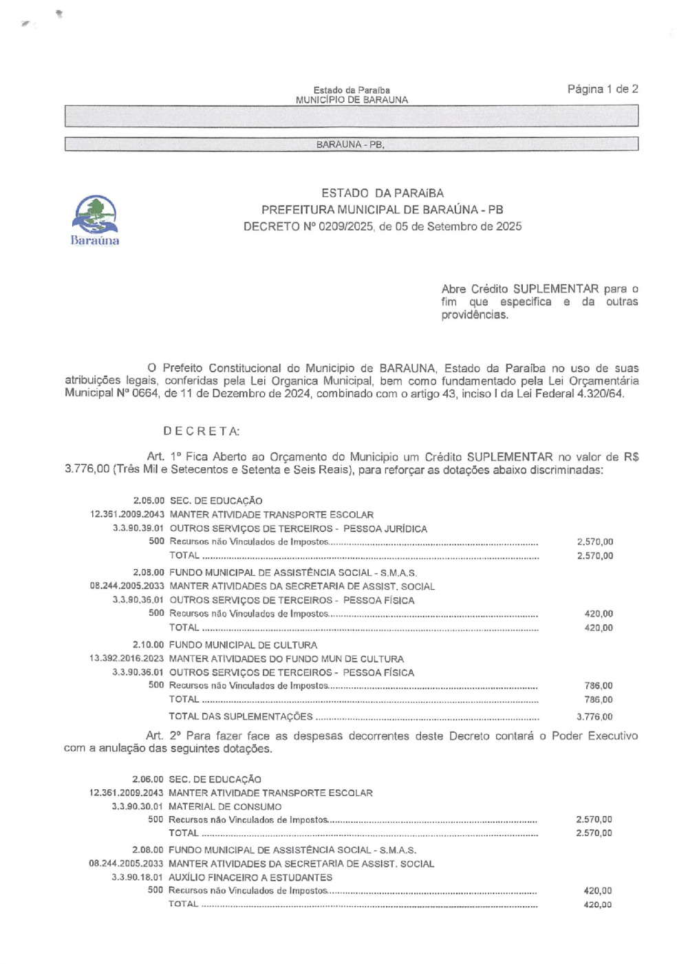 DECRETO Nº 0209/2025 ABRE CREDITO SUPLEMENTAR. - 20 DE JANEIRO DE 2026.