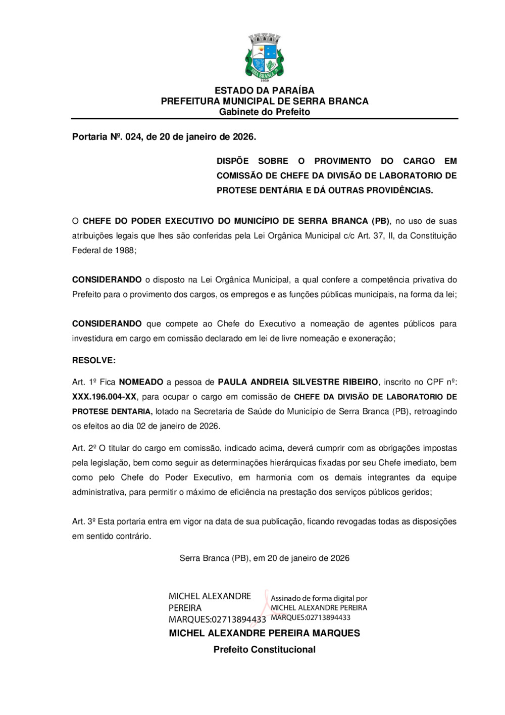 PORTARIA N° 0024/2026 - NOMEAÇÃO DE PAULA ANDREIA SILVESTRE RIBEIRO