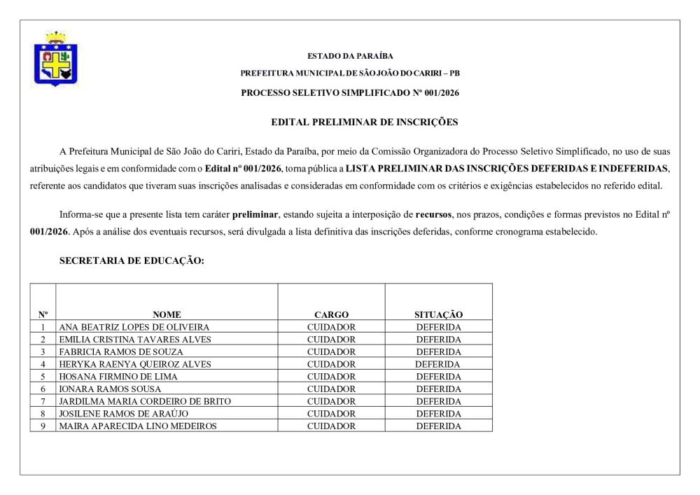EDITAL RESULTADO PRELIMINAR DE INSCRIÇÕES