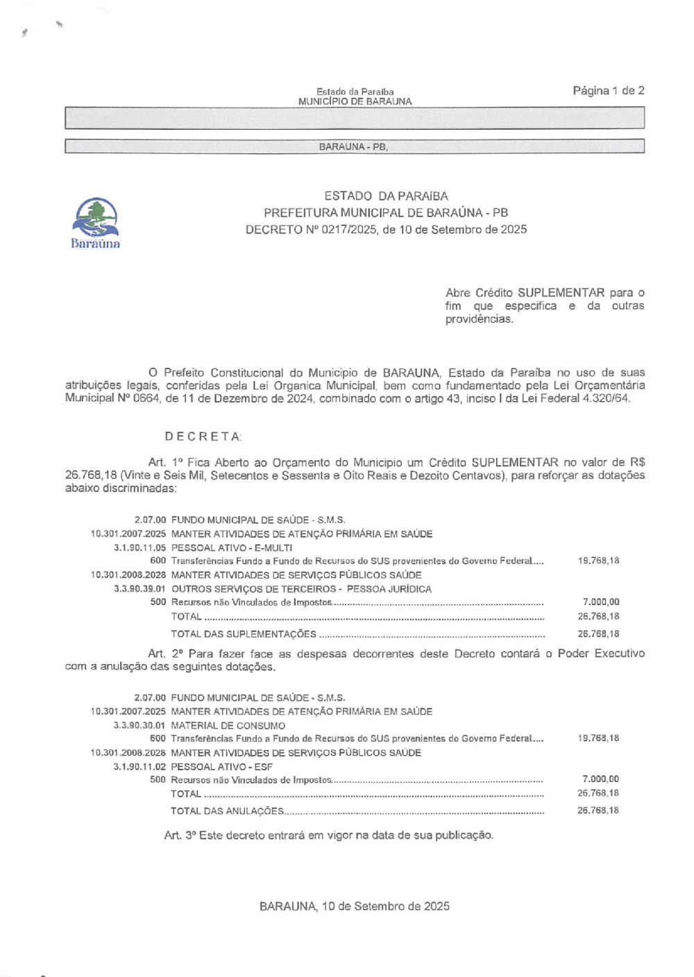 DECRETO Nº 0217/2025 ABRE CREDITO SUPLEMENTAR. - 21 DE JANEIRO DE 2026.