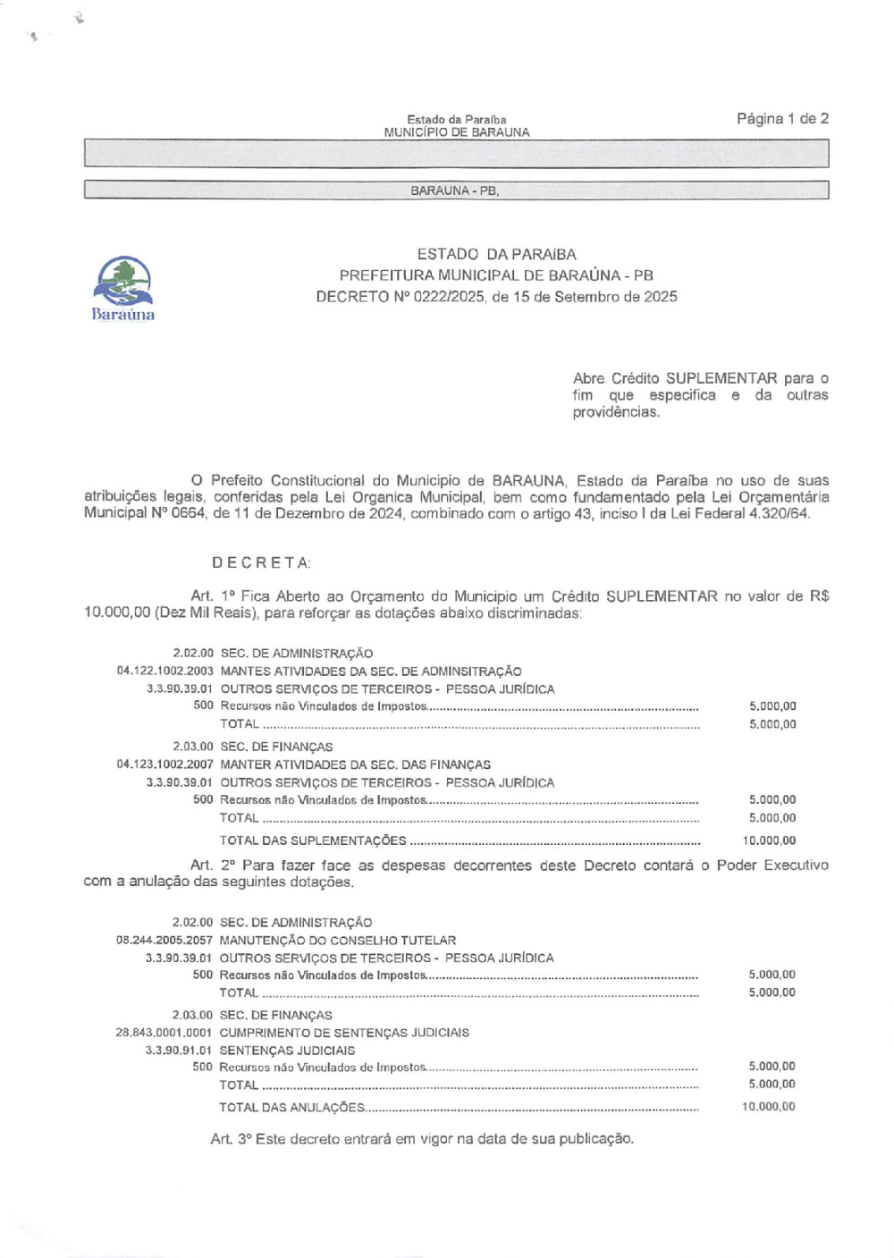 DECRETO Nº 0222/2025 ABRE CREDITO SUPLEMENTAR. - 21 DE JANEIRO DE 2026.