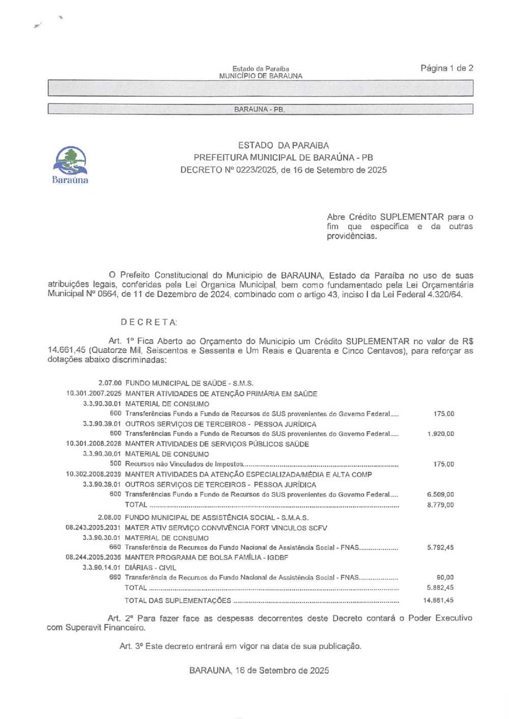 DECRETO Nº 0223/2025 ABRE CREDITO SUPLEMENTAR. - 21 DE JANEIRO DE 2026.