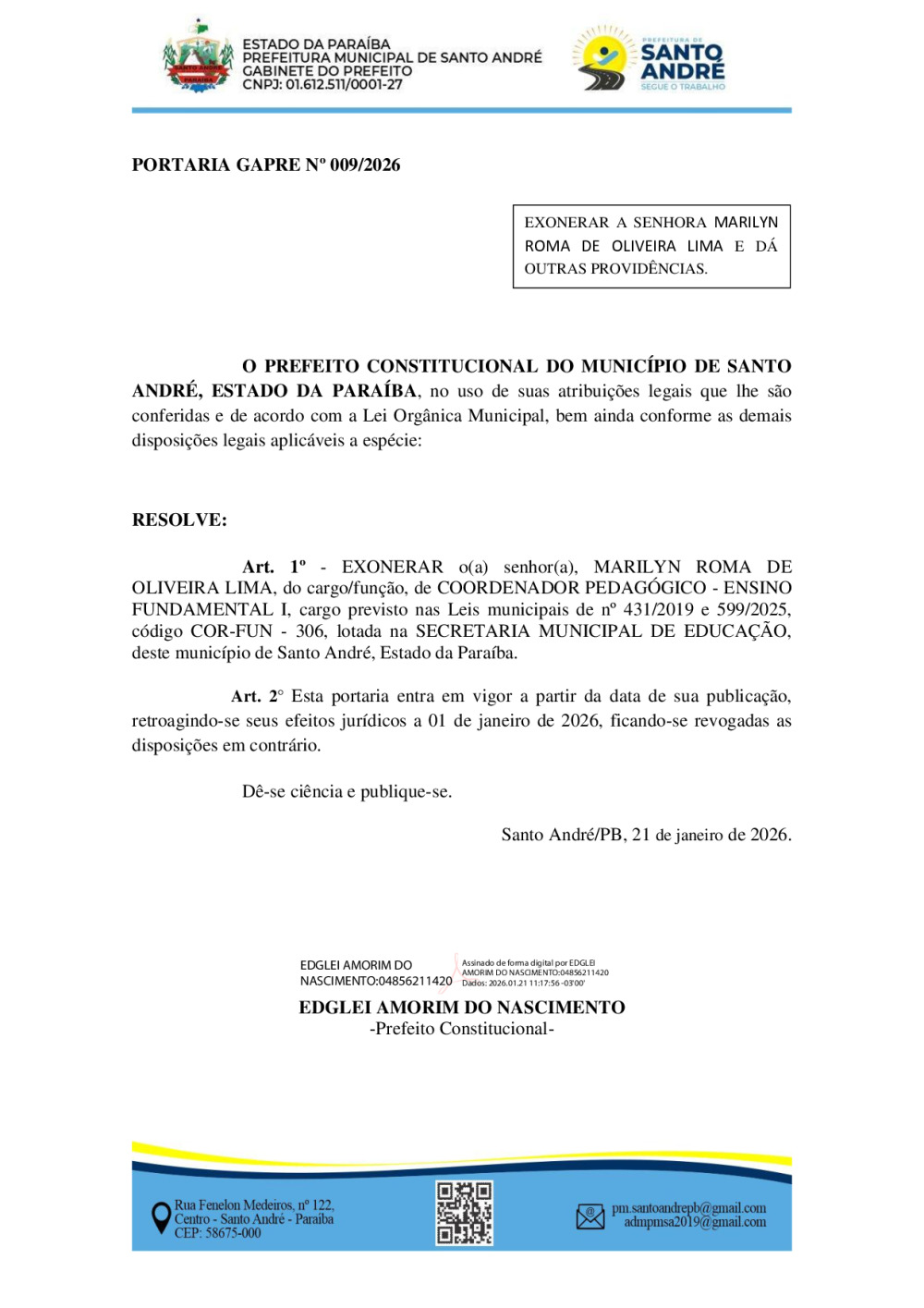PORTARIA GAPRE Nº 009/2026 - EXONERAR A SENHORA MARILYN ROMA DE OLIVEIRA LIMA E DÁ OUTRAS PROVIDÊNCIAS.
