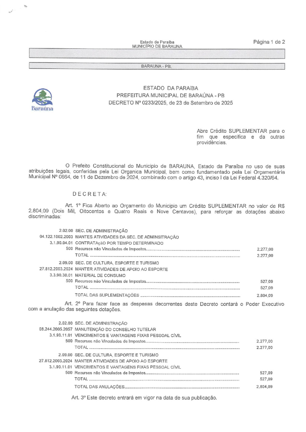 DECRETO Nº 0233/2025 ABRE CREDITO SUPLEMENTAR. - 21 DE JANEIRO DE 2026.