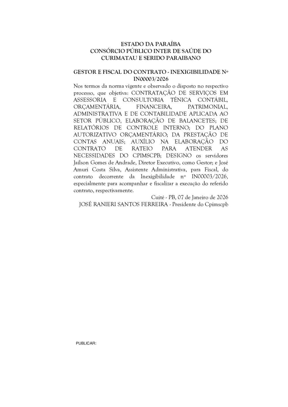 GESTOR E FISCAL DO CONTRATO - INEXIGIBILIDADE N° IN 0003/2026