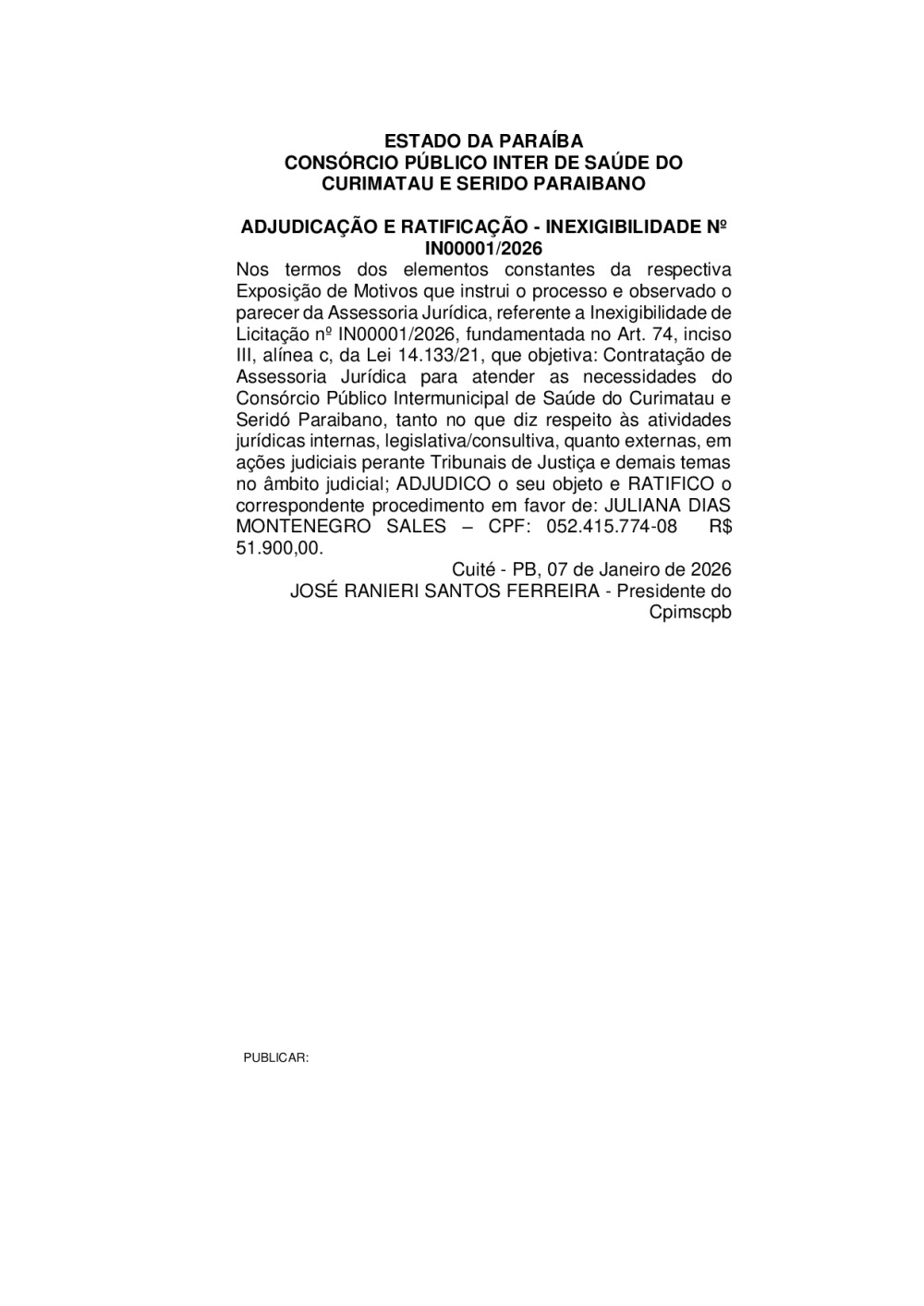 ADJUDICAÇÃO E RATIFICAÇÃO - INEXIGIBILIDADE N° IN 0001/2026