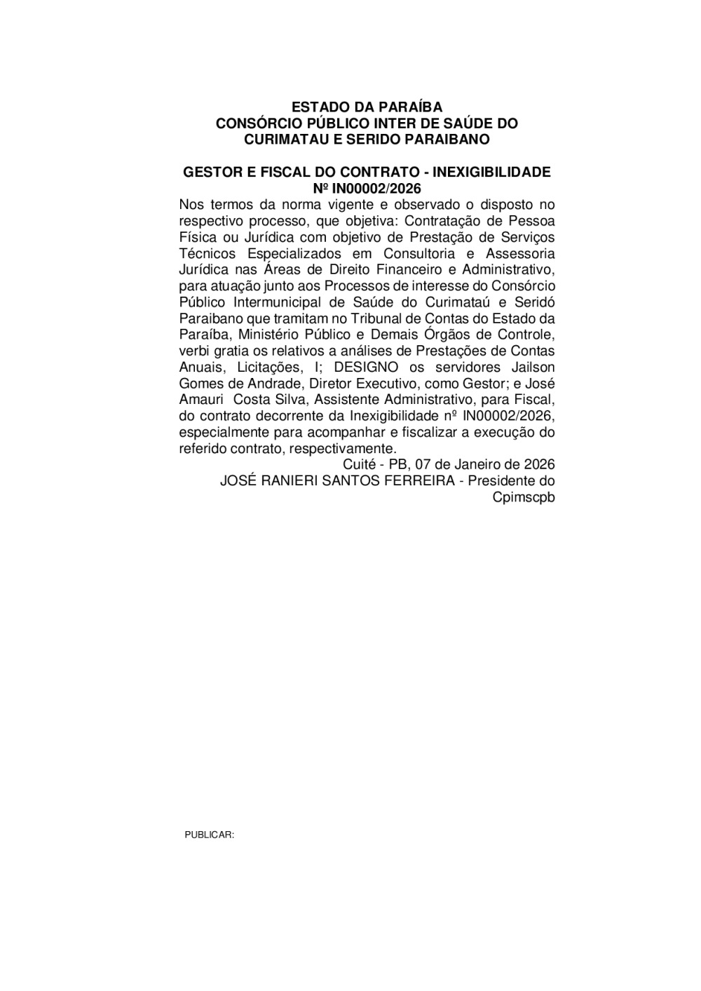 GESTOR E FISCAL DO CONTRATO - INEXIGIBILIDADE N° IN 0002/2026